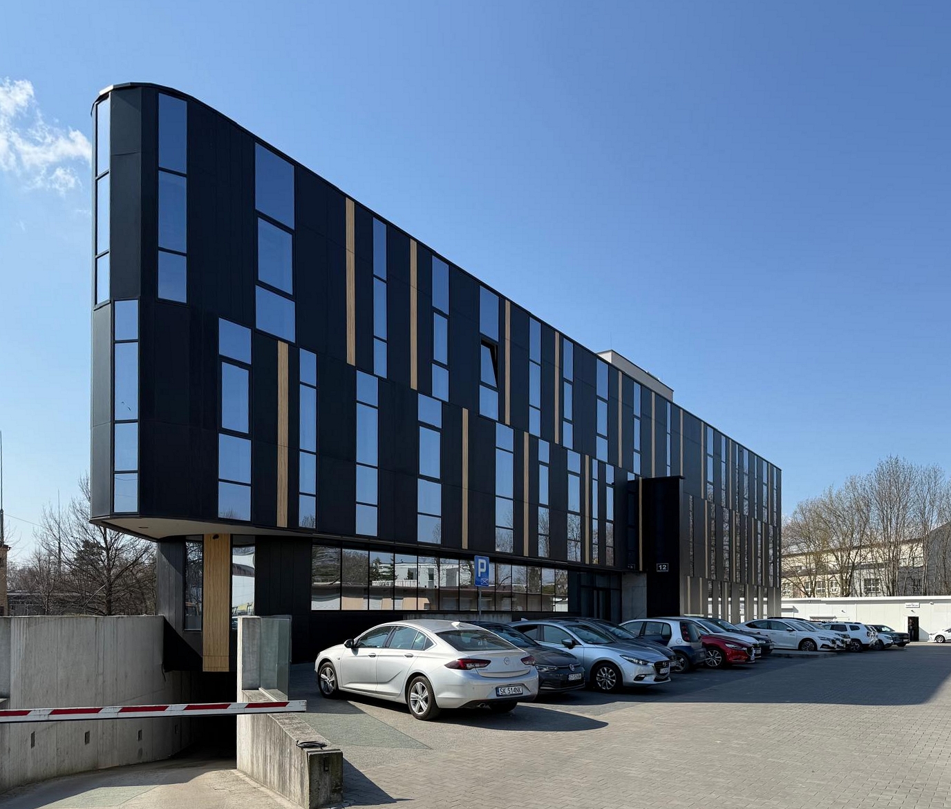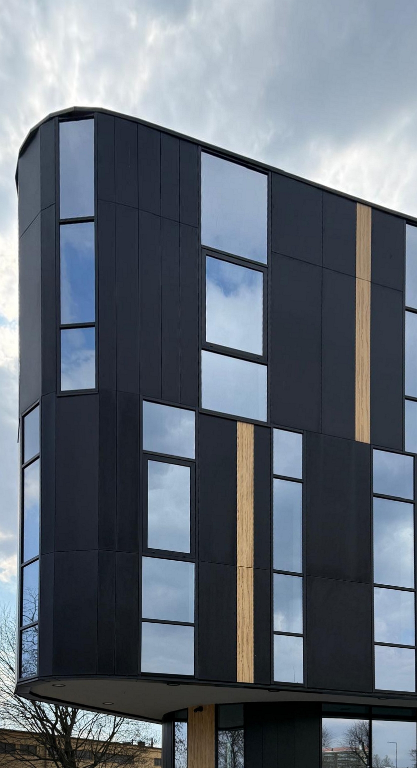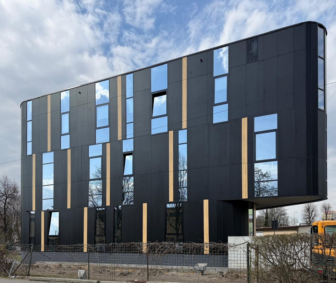 Wysokość i kształt budynku dostosowana została do otaczającej przestrzeni. Zwarta bryła, ortogonalny układ w stosunku do sąsiednich obiektów sprawia, że projektowany biurowiec będzie korespondował z charakterystyką architektoniczną otoczenia. Ciemna barwa oraz pasma pionowych okien zmiennej szerokości w nieregularnym układzie, wypełnione refleksyjnym szkłem będą harmonizowały z zielenią wysoką i niską, jak również odbijały refleksy wszelkich obiektów otoczenia uatrakcyjniając wygląd. Ponad to inkrustacja elewacji kontrastującymi wąskimi pasmami drewnianymi (lub drewnopodobnymi) dodatkowo uatrakcyjni obiekt podnosząc jakość całego kwartału.