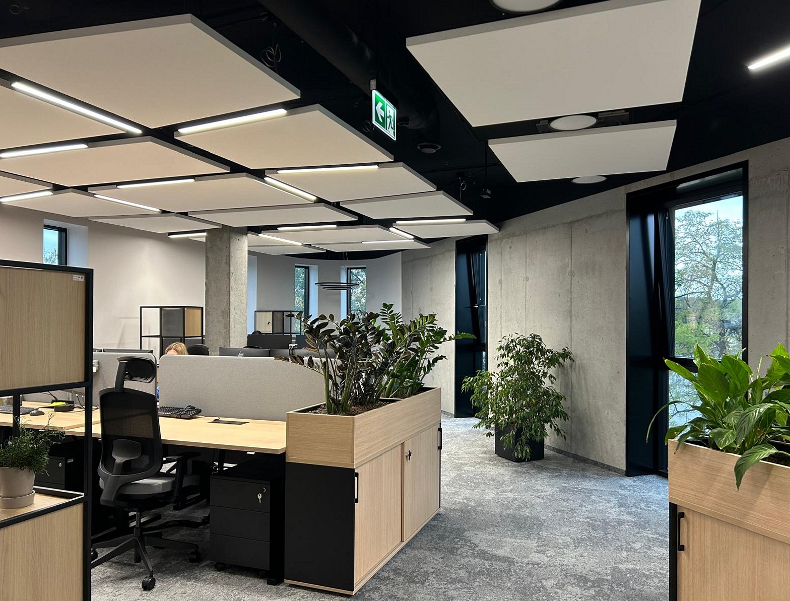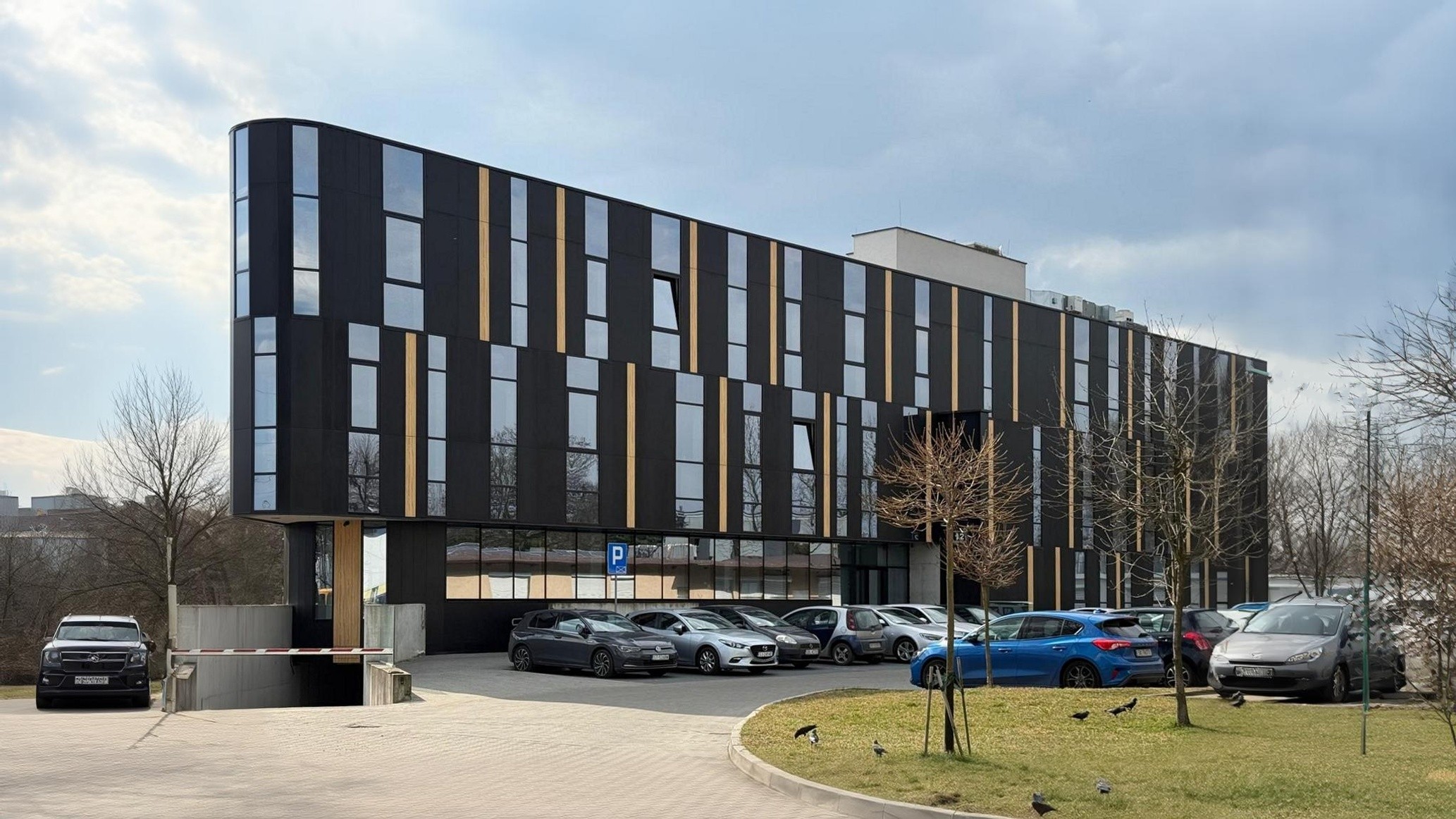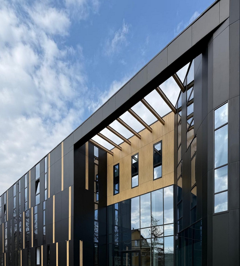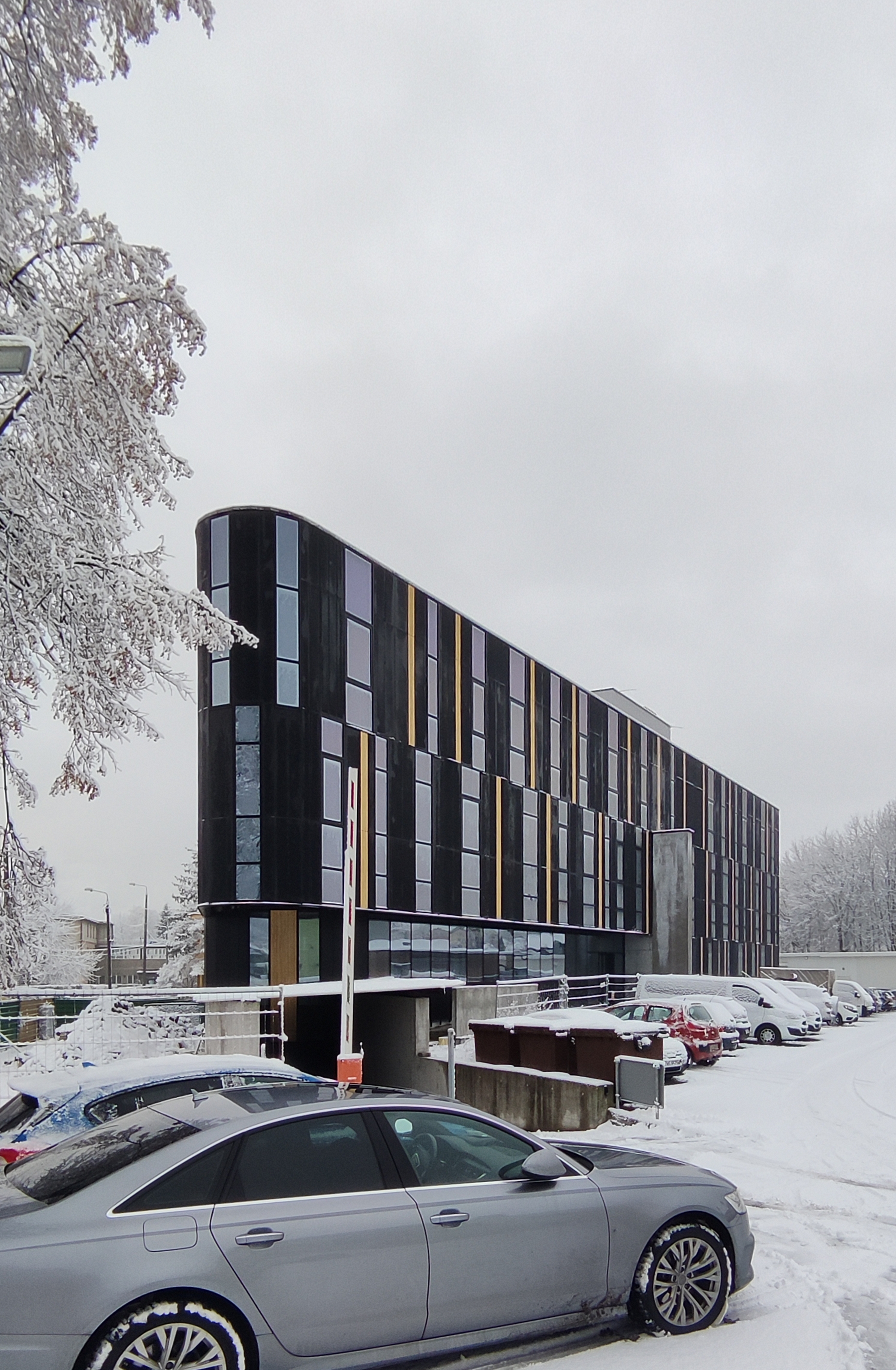 Wysokość i kształt budynku dostosowana została do otaczającej przestrzeni. Zwarta bryła, ortogonalny układ w stosunku do sąsiednich obiektów sprawia, że projektowany biurowiec będzie korespondował z charakterystyką architektoniczną otoczenia. Ciemna barwa oraz pasma pionowych okien zmiennej szerokości w nieregularnym układzie, wypełnione refleksyjnym szkłem będą harmonizowały z zielenią wysoką i niską, jak również odbijały refleksy wszelkich obiektów otoczenia uatrakcyjniając wygląd. Ponad to inkrustacja elewacji kontrastującymi wąskimi pasmami drewnianymi (lub drewnopodobnymi) dodatkowo uatrakcyjni obiekt podnosząc jakość całego kwartału.